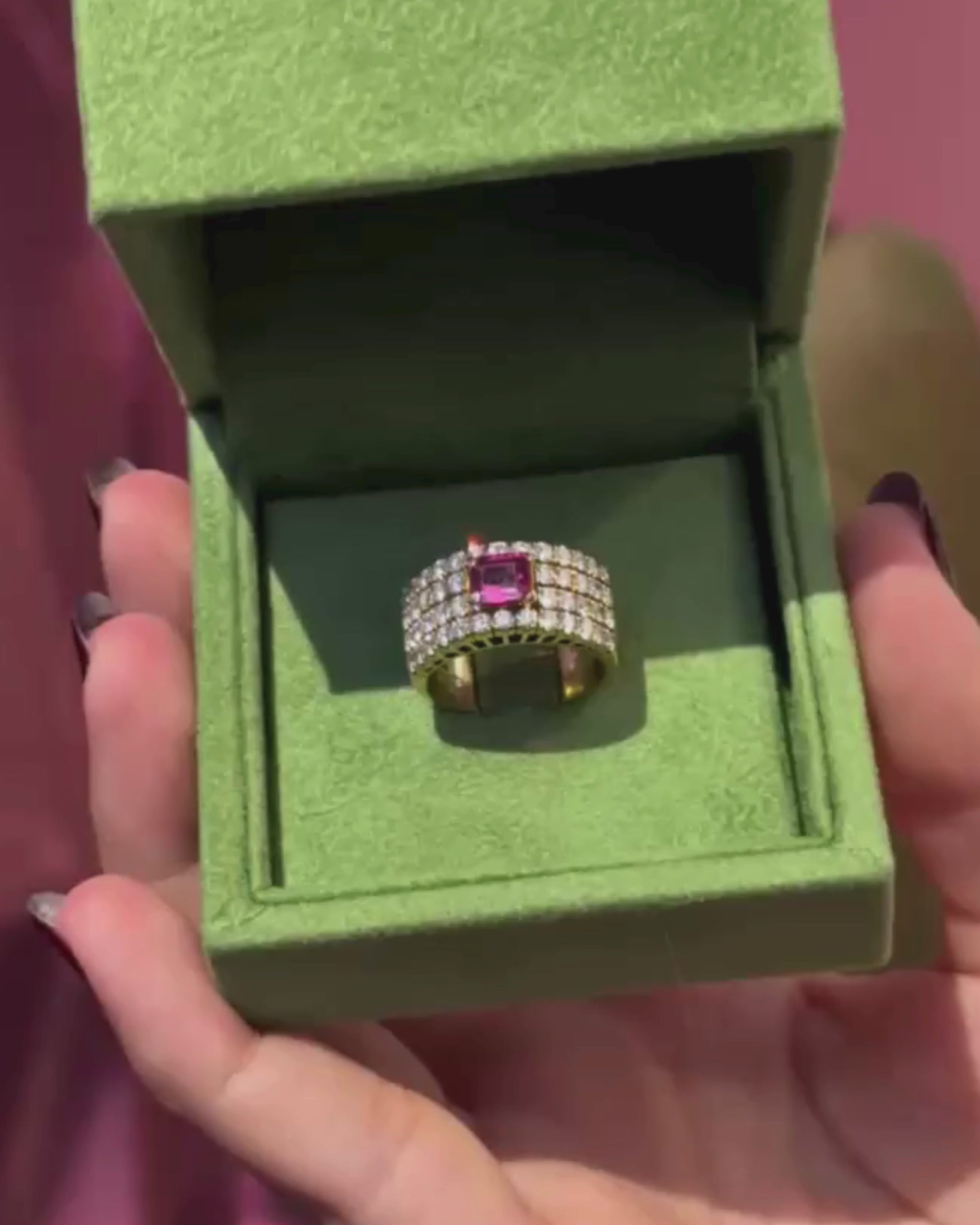 This 1970s band ring is crafted in precious metal and features a natural octagonal-cut ruby measuring 5.98 × 5.20 × 3.02 mm. The vivid center stone is framed by forty-six brilliant-cut diamonds totaling approximately 1.64 ct, graded GH in color and VS in clarity, adding exceptional brilliance and contrast. A bold and iconic design, perfectly representative of 1970s style and strong craftsmanship.