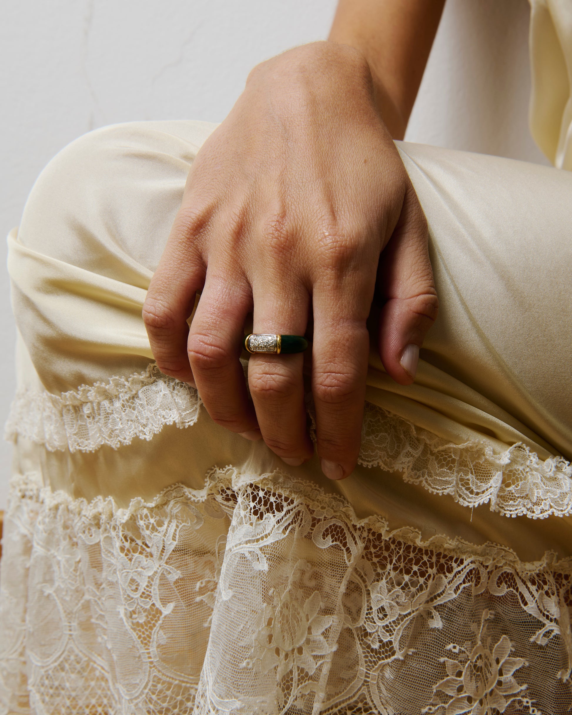 Isadora is a refined vintage 18kt yellow gold ring decorated with green guilloché enamel and 0.20 ct of 13 brilliant-cut diamonds set in white gold. A sophisticated piece inspired by Art Deco elegance and timeless craftsmanship. Size 14.