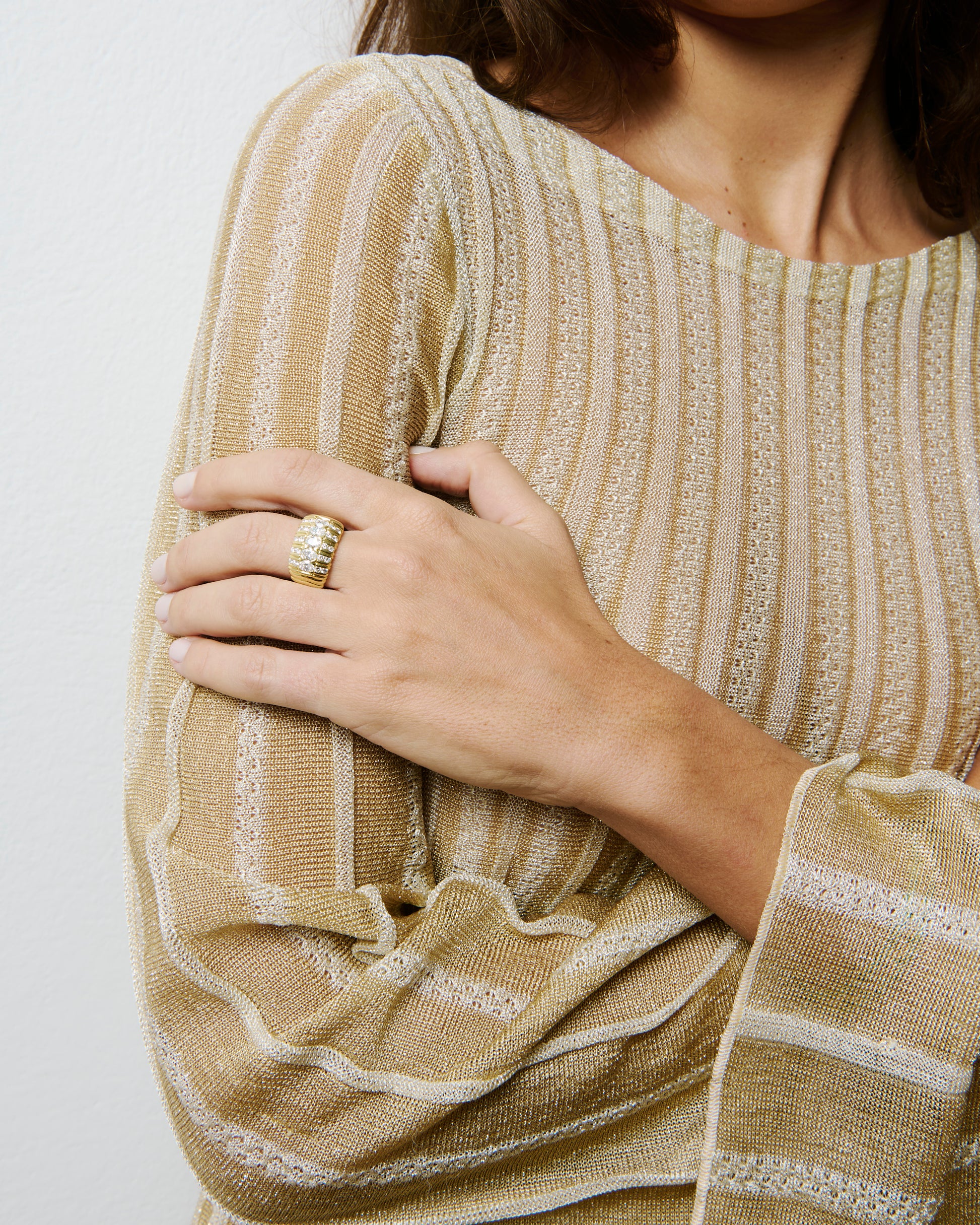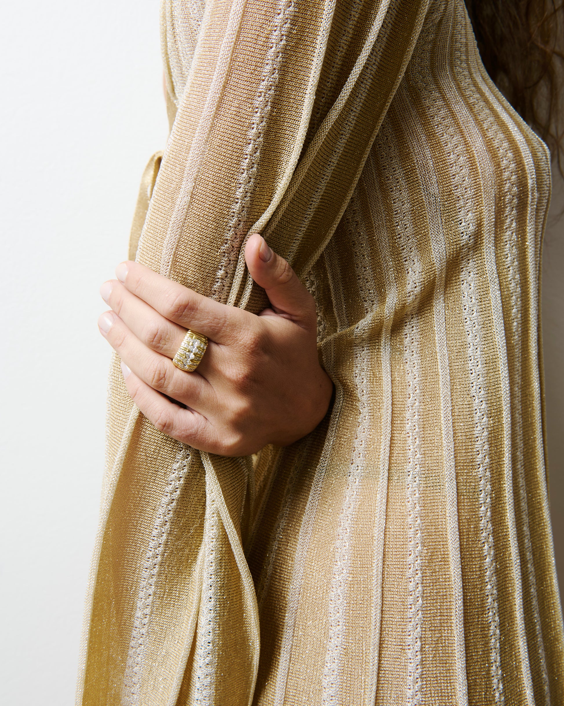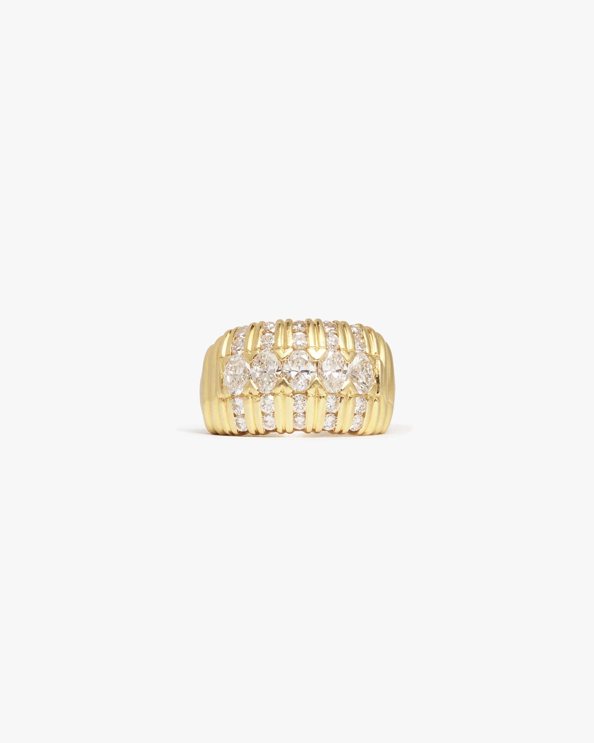 Lucinda is a vintage bombé ring in 18kt yellow gold featuring approx. 1.70 ct of 25 mixed-cut diamonds set in an intricate openwork honeycomb design. A luminous, sculptural jewel from the 1970s–1990s, rich in brilliance and texture. Size 13.